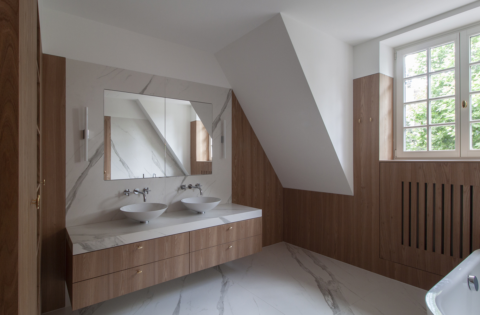 In einem Haus aus der Gründerzeit wurde ein Badezimmer, das letztmals in den 1990er-Jahren umgebaut wurde, neu konzipiert. Durch das Einführen einer raumhaltigen Wand, in der Dusche und Toilette verschwinden, wird dem Raum seine Grosszügigkeit zurückgegeben. Furnierte Wandpaneele und Einbaumöbel sorgen für Behaglichkeit, während grossformatige Steinplatten diejenigen Flächen bekleiden, die mit Wasser in Berührung kommen.